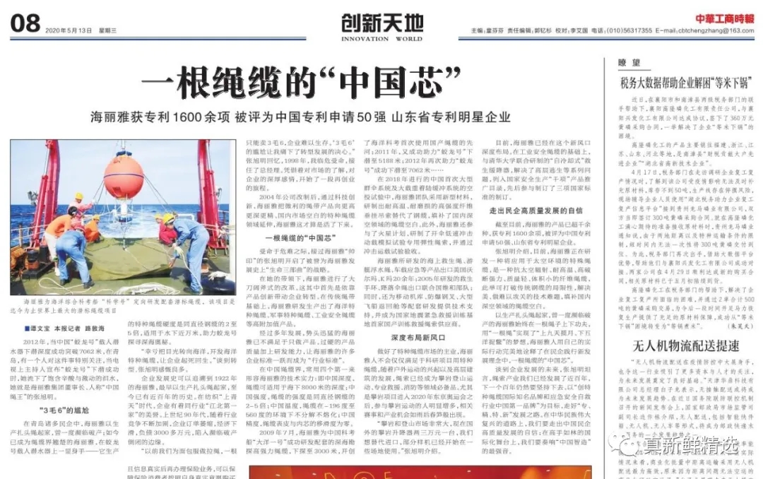 《中華工商時報》八版頭題:一根繩纜的“中國芯”