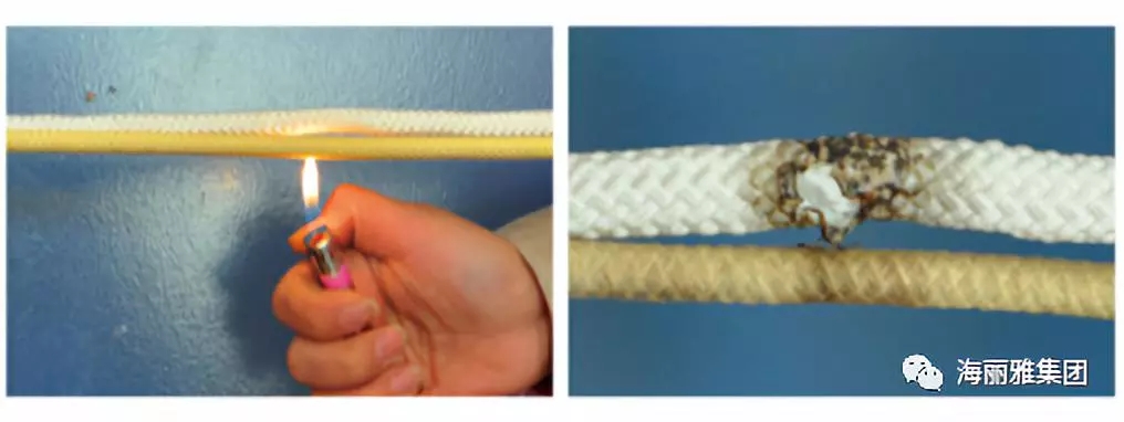 “海麗安心”防火逃生繩(黃色)與普通材料逃生繩(白色)防火實(shí)驗(yàn)對(duì)比