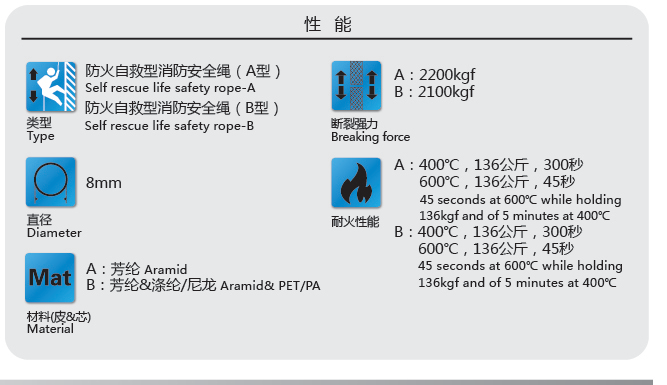 防火逃生繩斷裂強(qiáng)度大于2000kgf,低延伸率,特殊防火設(shè)計(jì),400℃,136公斤,300秒;600℃,136公斤,45秒不出現(xiàn)斷裂現(xiàn)象。適用于消防、救援、火災(zāi)逃生、高溫環(huán)境作業(yè)等。